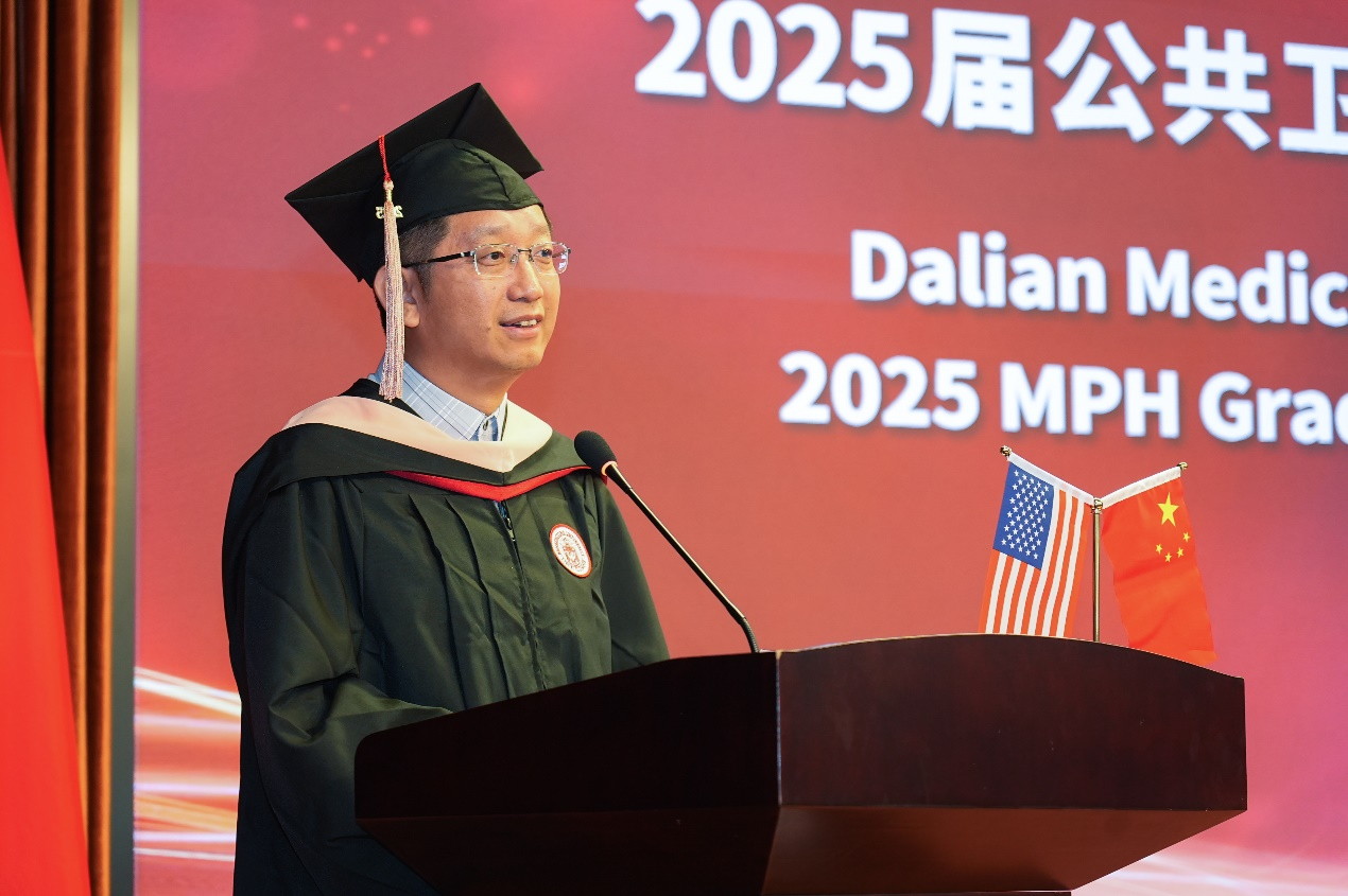 优秀校友代表、大连市第七人民医院老年病房主任姚烨发言。他向毕业生致以祝贺,并回顾了在MPH项目课程学习与学术讨论的收获,强调公卫人需牢记使命、投身实践。他结合工作经验提出三点建议:保持学习、注重合作、敢于探索。他寄语毕业生将毕业视为新起点,牢记公卫人的使命责任,在各自领域拼搏奋斗。最后,他祝福大连医科大学与美国班尼迪克大学发展蒸蒸日上,师生皆展美好前程。