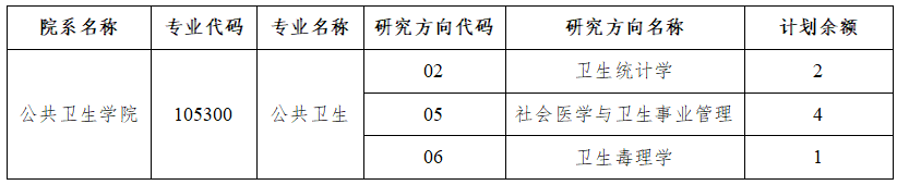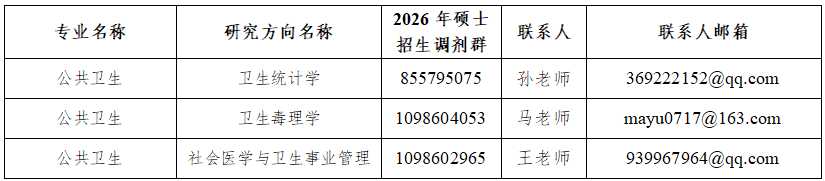 接收调剂专业详见《公共卫生学院2026年硕士研究生招生第二批调剂计划余额信息》,根据调剂复试情况,各专业实际录取人数可能略有调整,具体以实际招生人数为准。